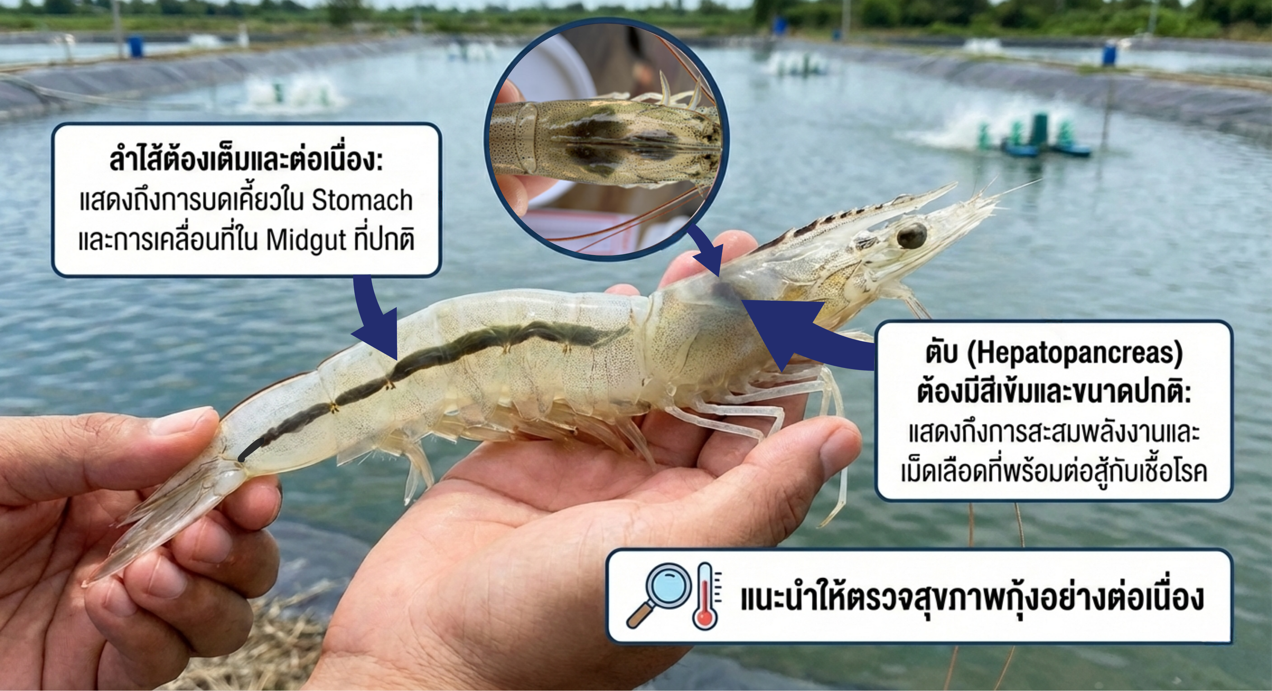 - แนะนำให้ตรวจสุขภาพกุ้งอย่างต่อเนื่อง